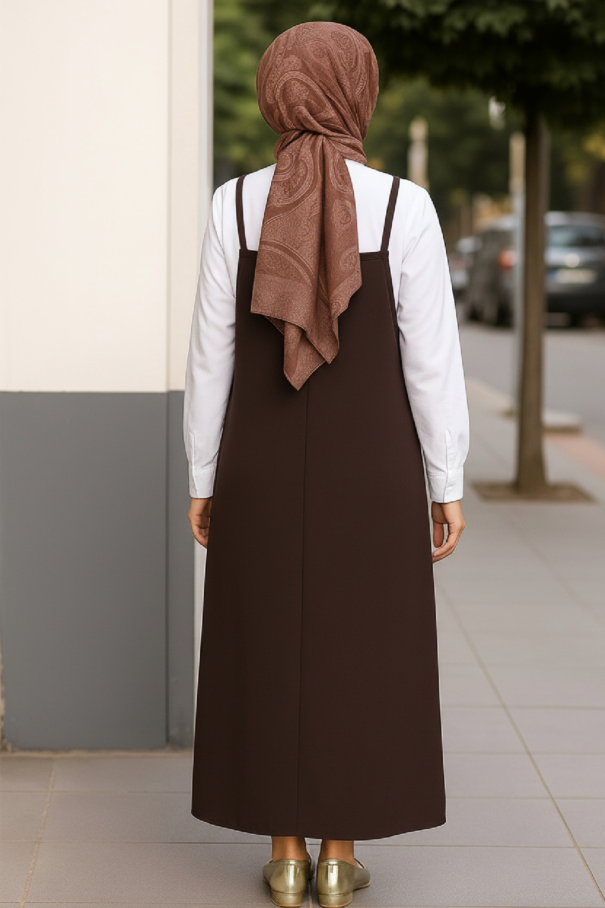 • Her kadının dolabında mutlaka bulunması gereken bu kadın acı kahverengi askılı jile elbise, hem şık hem de pratik kombinler için ideal bir seçim.