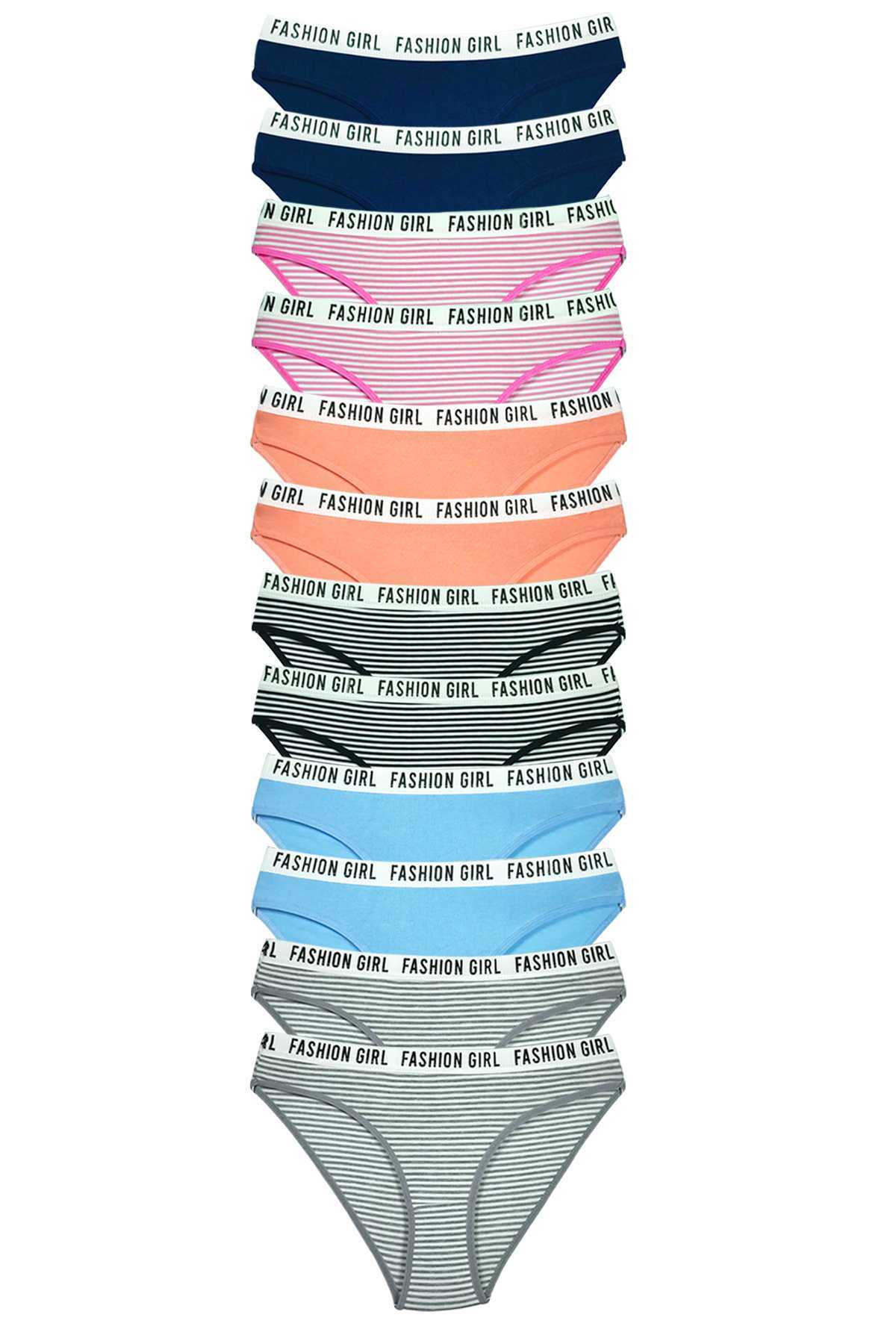 - 12 Adet Beli Yazılı Lastik Pamuk Kadın Külot