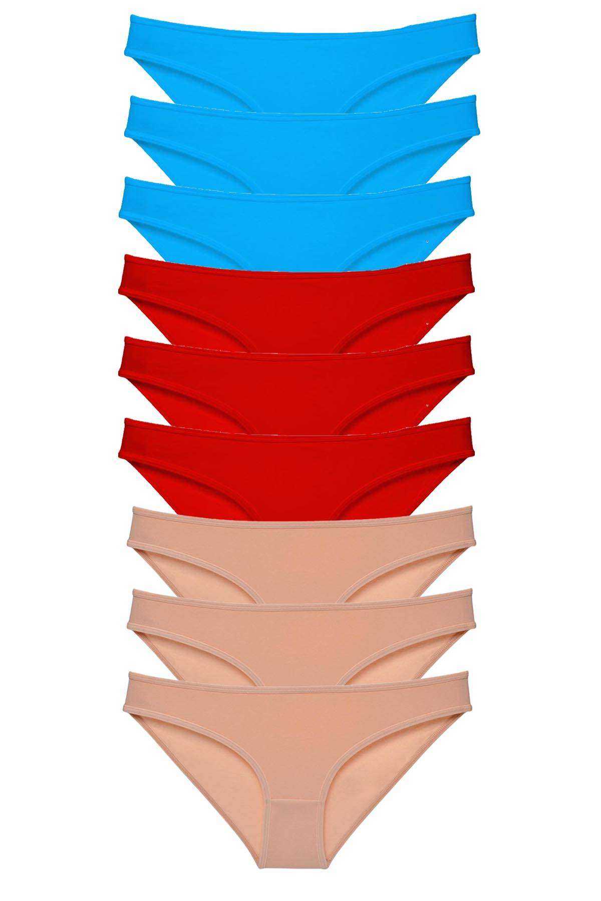 9 Adet Süper Eko Set Likralı Kadın Slip Külot Kırmızı Ten Mavi