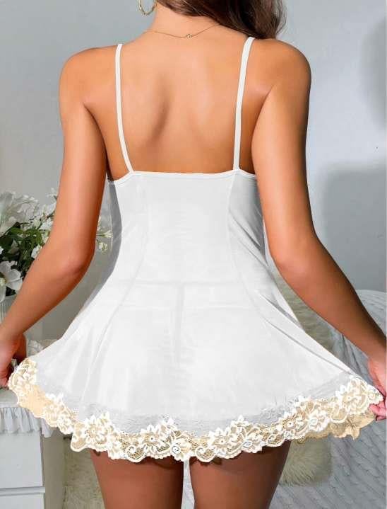 - Beyaz Dantel İşlemeli İnce Askılı Likralı Fantezi Tül Gecelik