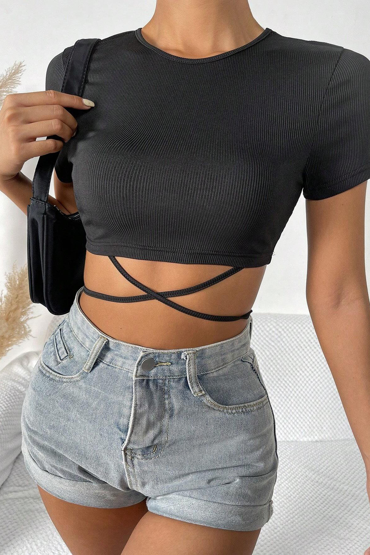 Siyah crop top bluz arayışınız mı var? Kaşkorse kumaştan üretilmiş, çapraz bağlamalı bu bluz ile tarzınızı yansıtın. İndirimli fiyat ve ücretsiz kargo fırsatını kaçırmayın!