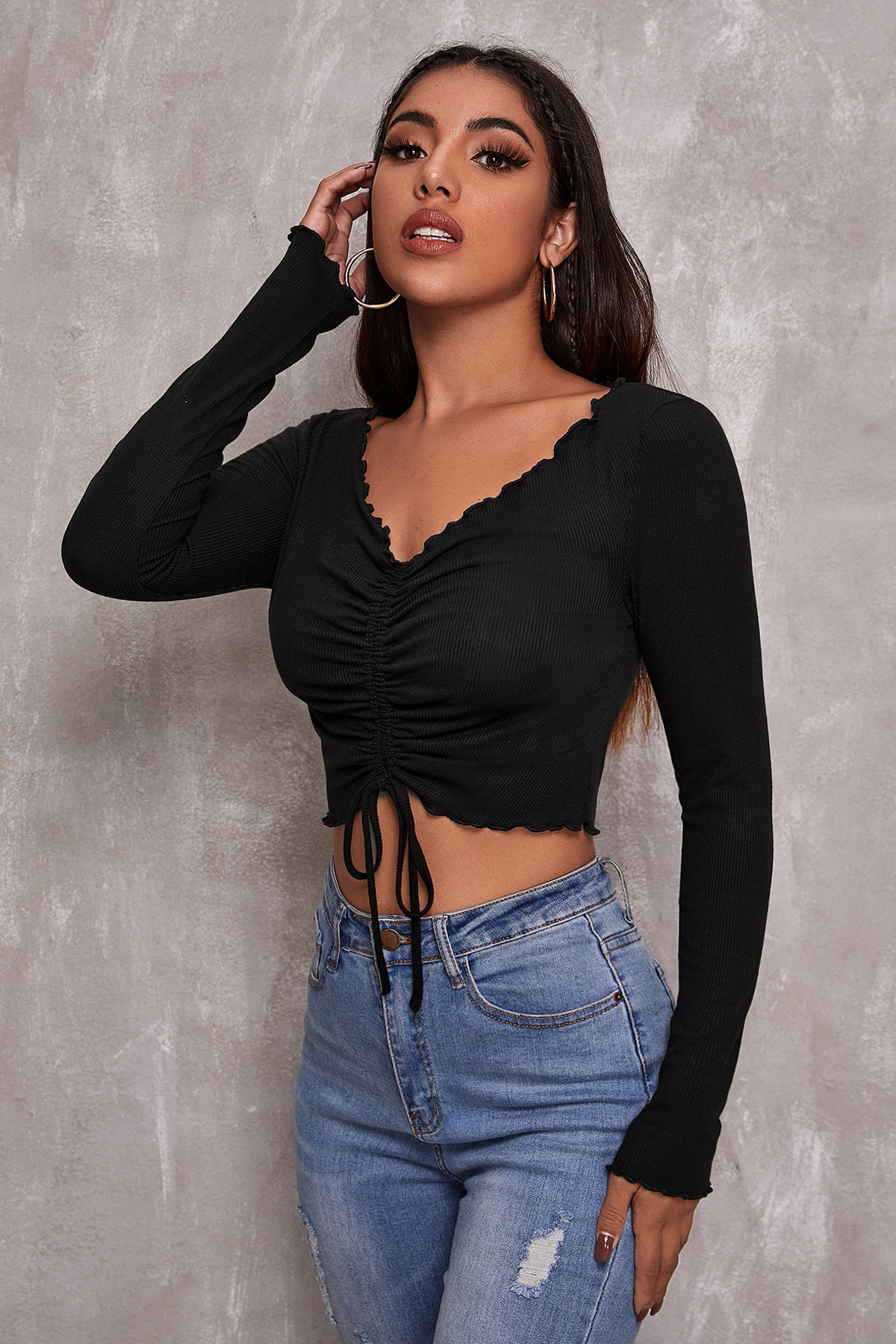 Görseldeki gibi, bu siyah crop top bluz zarif v yakası ve büzgülü tasarımıyla dikkat çekiyor. Uzun kolları ve hafif kaşkorse kumaşı sayesinde hem rahat hem de trend bir görünüm sunuyor.