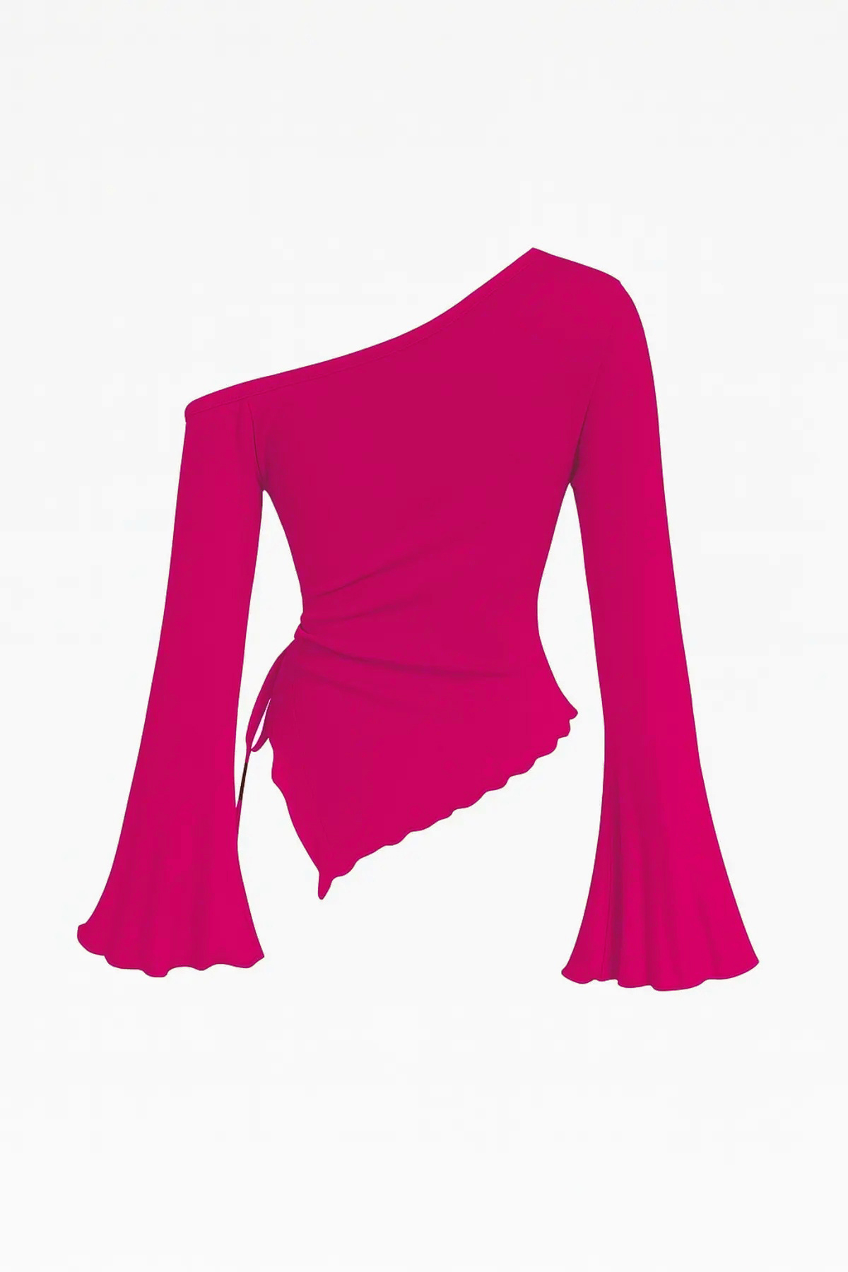 Göz Alıcı Tasarım: Bu çarpıcı fuşya renkli bluz, asimetrik yakasıyla modern bir dokunuş sunarken, uzun ispanyol kolları ve zarif drapeli detaylarıyla feminen bir hava yaratıyor. İncelediğiniz görselde gördüğünüz gibi, kumaşın dökümü kusursuz bir estetik oluşturuyor.
