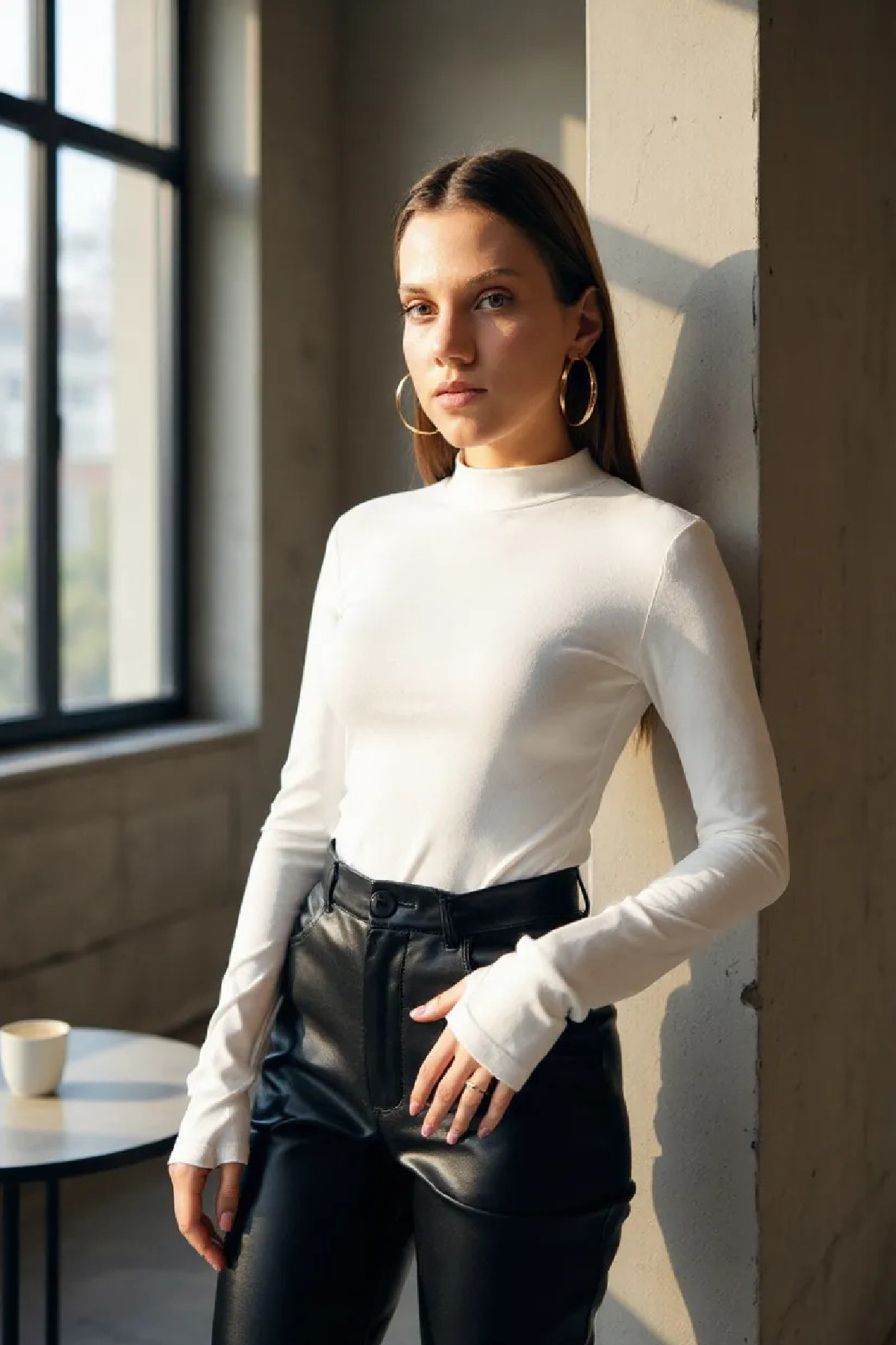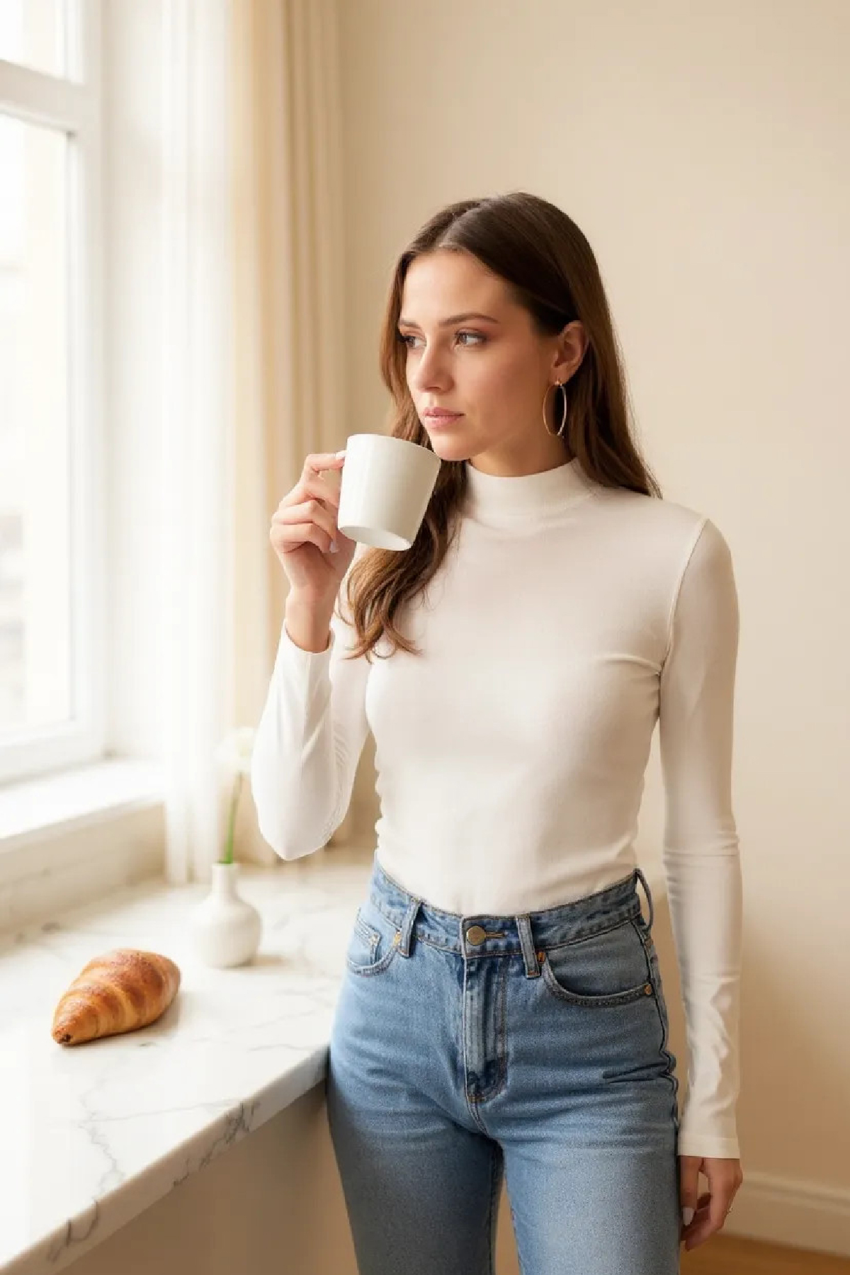 Görsel Betimlemesi: Bu body, zarif bisiklet yakasıyla dikkat çekiyor. Uzun kolları, parmak şeklinde daralan manşetleriyle sofistike bir görünüm sunuyor. Vücuda oturan (fit) kesimiyle feminen siluetinizi ön plana çıkarıyor. Kumaşı yumuşak ve esnek, beyaz rengi ise her kombine kolayca uyum sağlıyor.