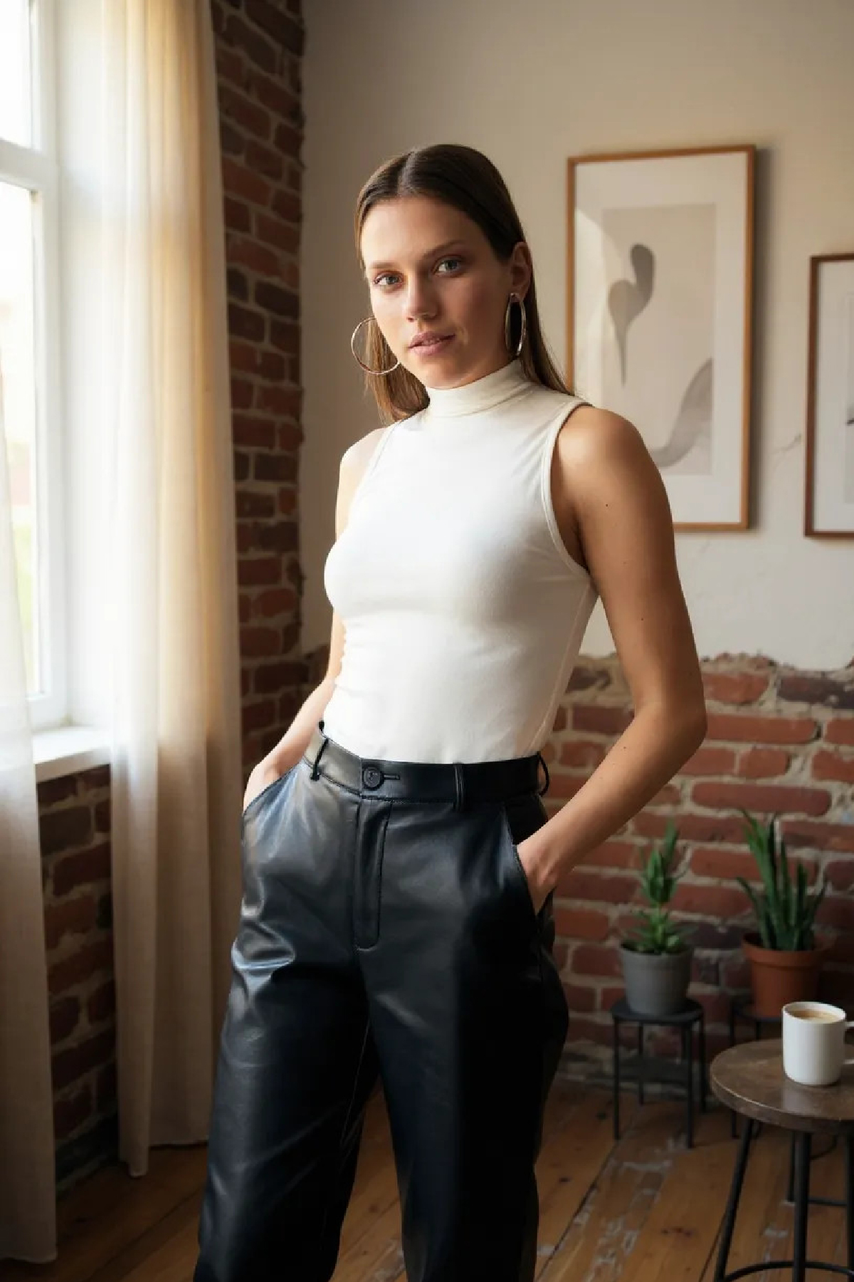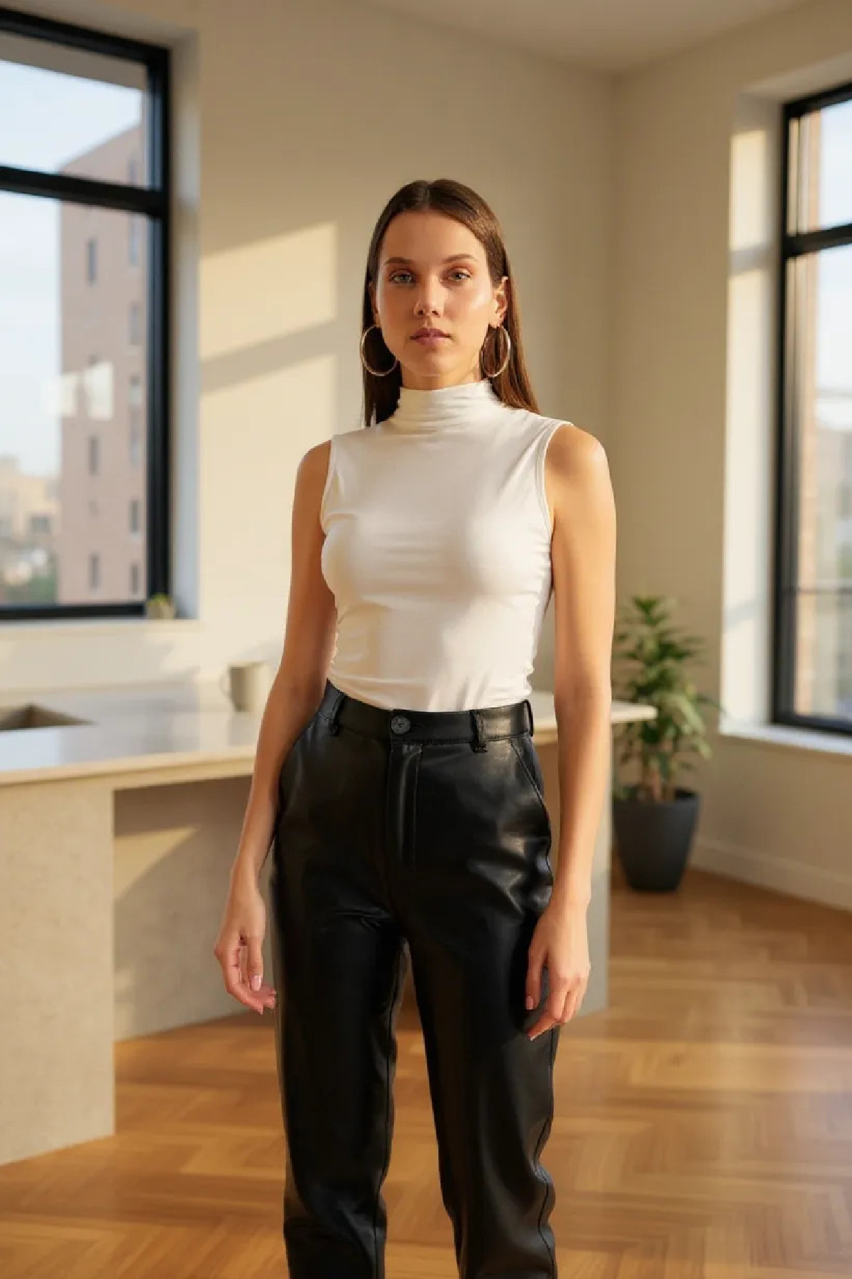Görseldeki gibi, bu beyaz kolsuz bluz, zarif balıkçı yaka detayı ve vücuda oturan (body) kesimiyle dikkat çekiyor. Düz dokusu, ince askıları ve kusursuz dikimiyle hem şıklığınızı tamamlayacak hem de modern bir görünüm elde etmenizi sağlayacaktır. Modelin fotoğraflarındaki gibi, doğal ışıkta beyaz rengi daha da belirginleşiyor.