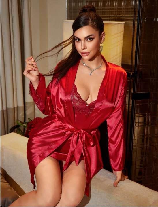 - Bordo Dantel İşlemeli İnce Askılı Saten 2'li Gecelik Sabahlık Takımı