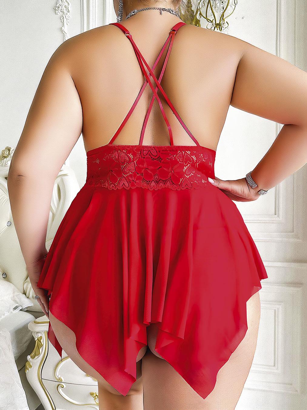 - Büyük Beden Dantel İşlemeli Fırfırlı Dekolteli Fantezi Tül Kırmızı Gecelik