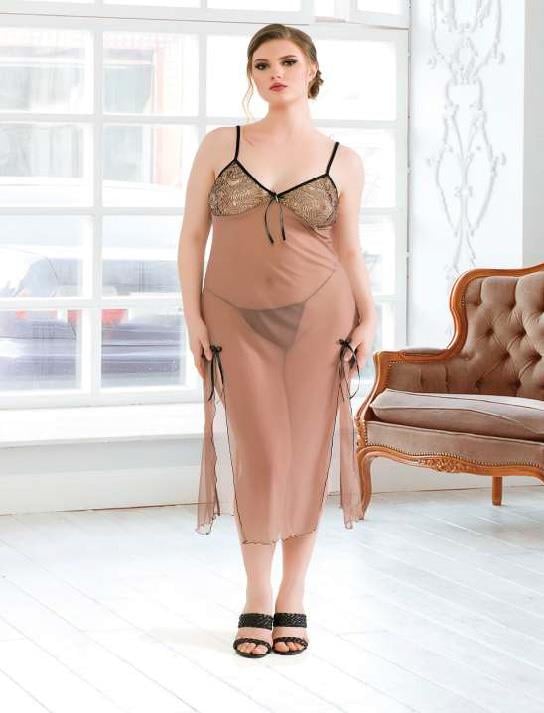 - Büyük Beden Kahverengi Tül Fantezi Uzun Yırtmaçlı Gecelik