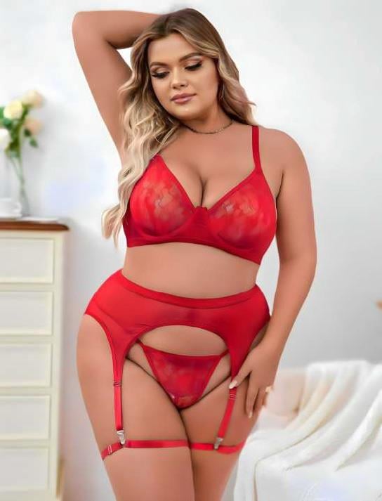 - Büyük Beden Kırmızı Dantel İşlemeli Fantezi Jartiyer Takımı