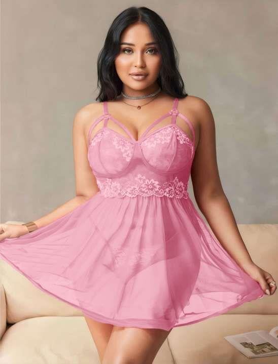 - Büyük Beden Pembe Dantel İşlemeli Göğüs Detaylı Tül Gecelik