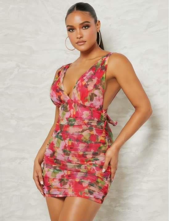 Çiçek Desenli Büzgülü Arkadan Bağlamalı Fantezi Elbise