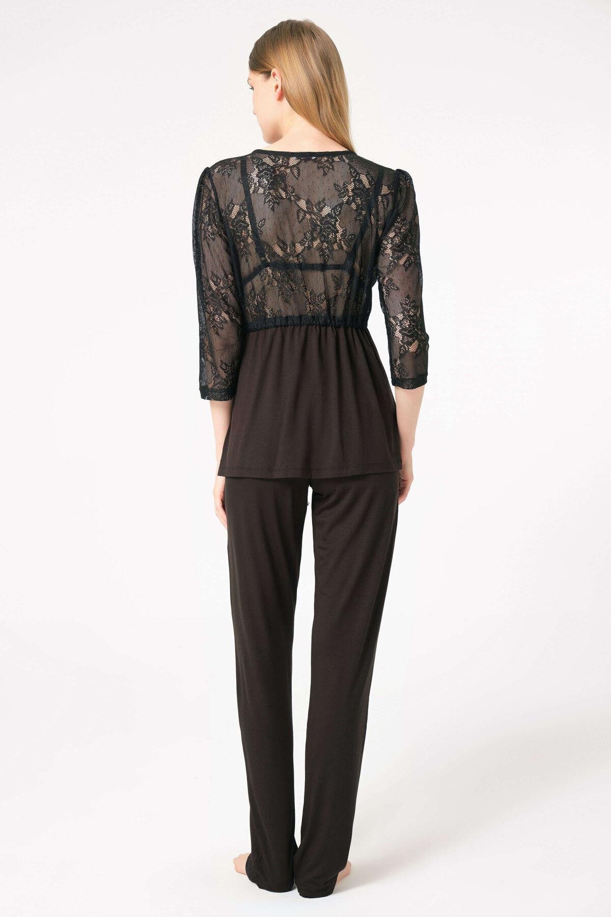 Dantelli Sabahlık Balensiz Desteksiz Dolgusuz Yaka Detaylı Sütyen Ve Pantolon Pijama 3'lü Takım