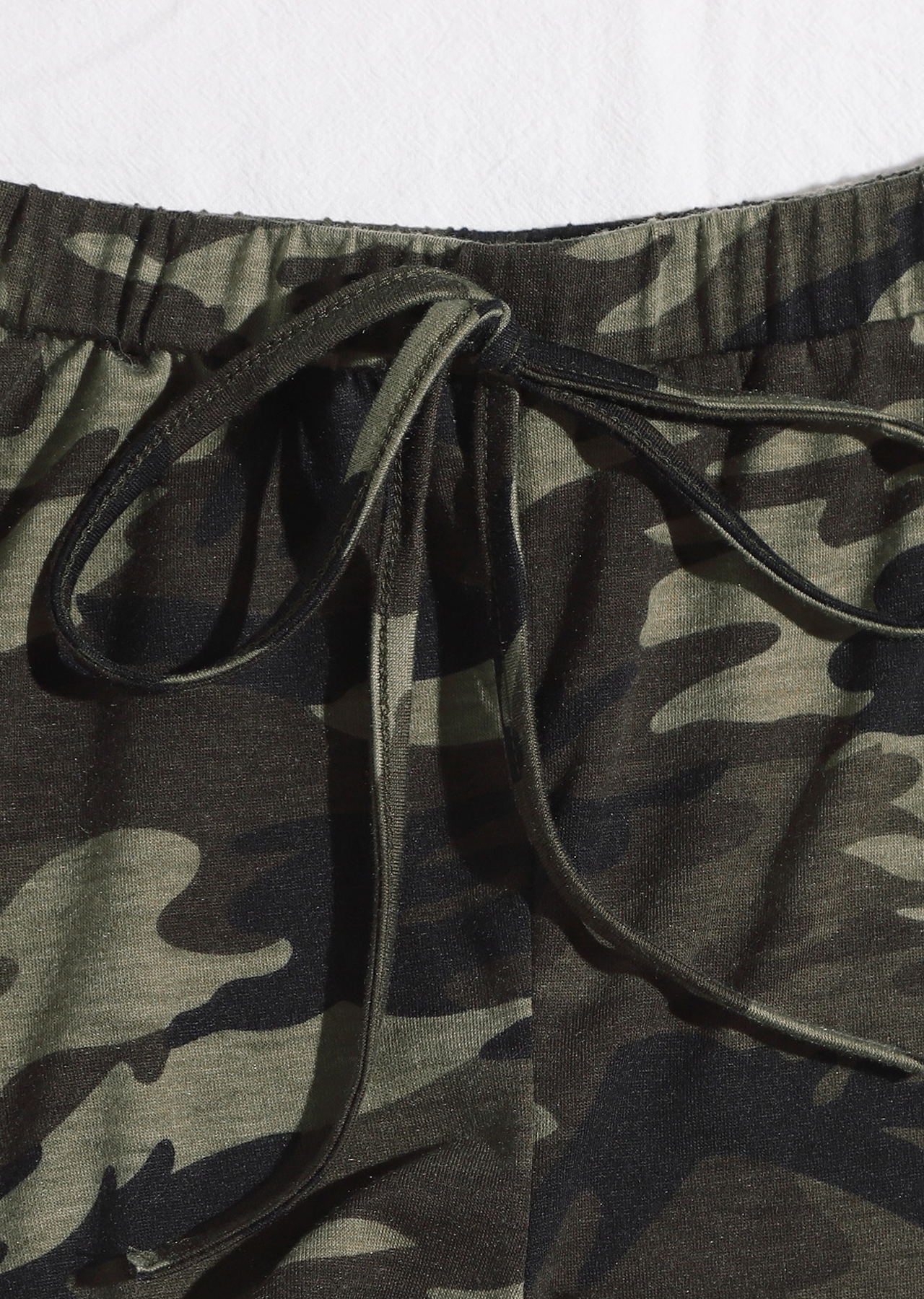Görsel Detaylar: Ürün, yumuşak beyaz zemin üzerinde sergileniyor. Kamuflaj deseni, askılı crop top ve şortun her yerinde belirgin bir şekilde yer alıyor. Şortun yanlarında bağcıklı detaylar bulunuyor ve iç kısmı pamuklu kumaşla kaplanmış. Üst kısmındaki ince askılar, dekolteyi zarifçe vurguluyor. Genel görünüm, rahatlık ve stilin mükemmel uyumunu yansıtıyor.