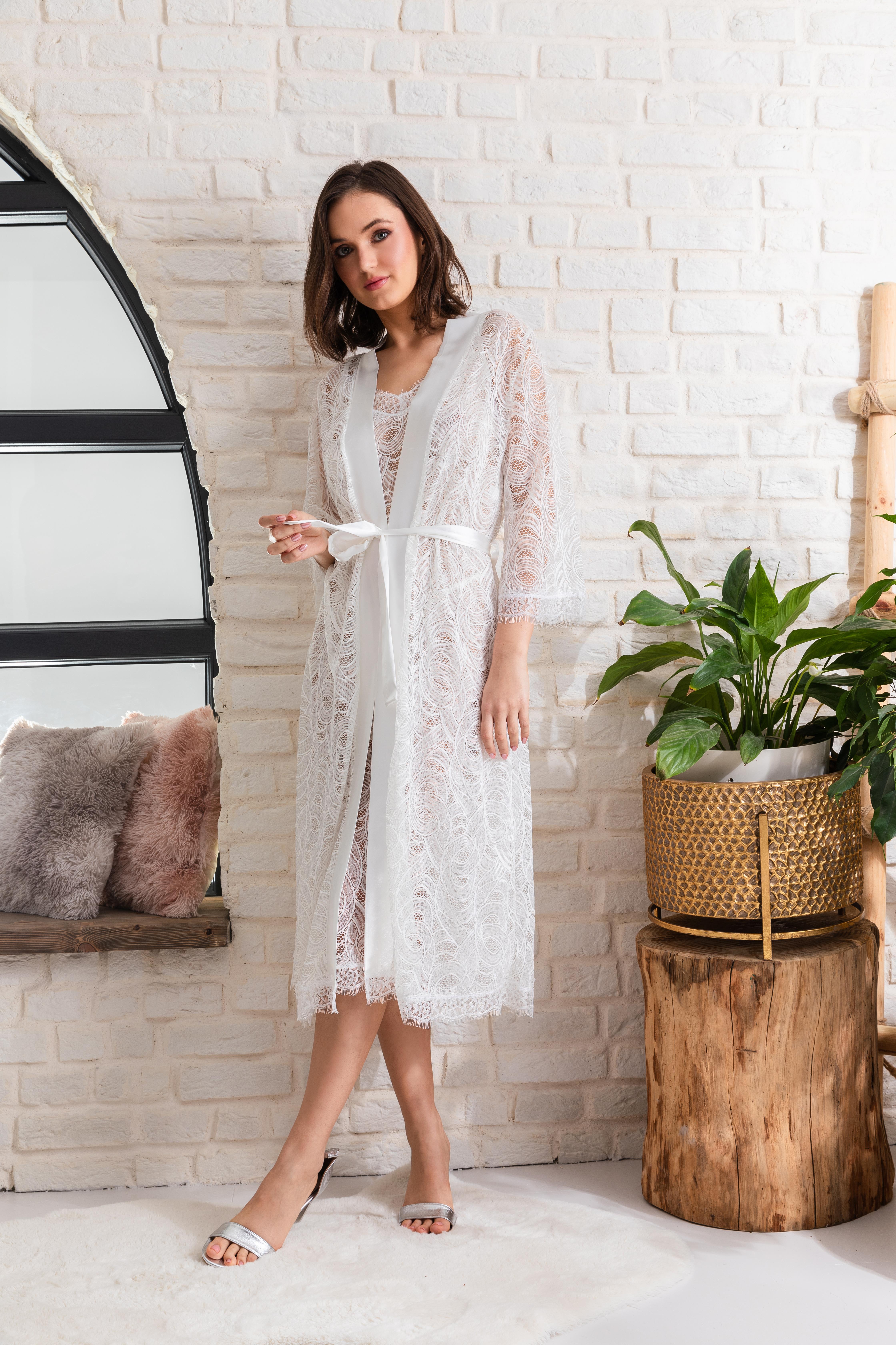 Gelin Set Transparan Midi Boy Kuşaklı Sabahlık Ekru (mgp12176)