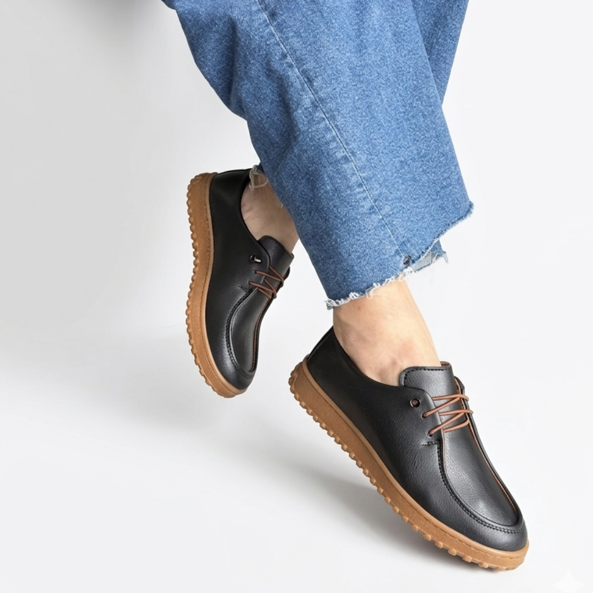 Guot Siyah Cilt Bağcıklı Babet Ayakkabı