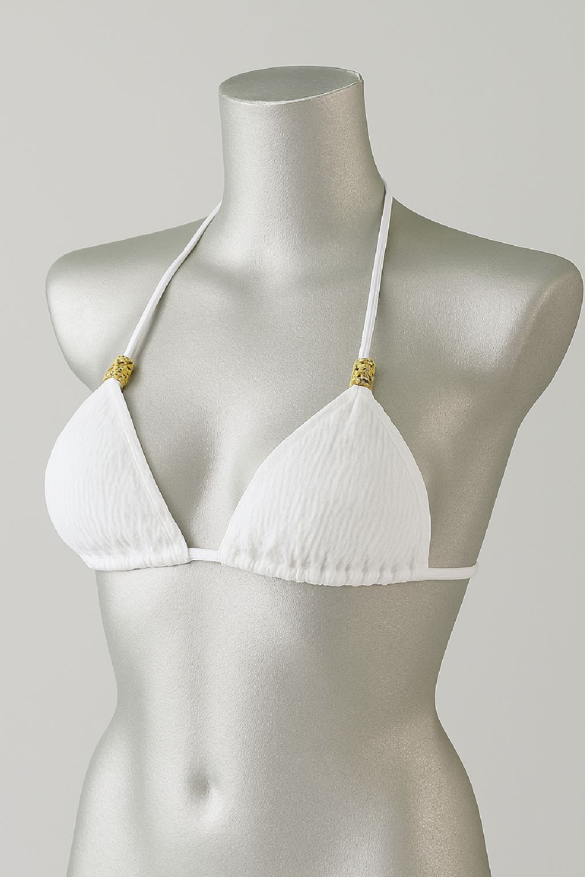 - • Altın tonlu aksesuar detayları ile sade beyaz rengi şık bir şekilde tamamlayan bu bikini üstü, plajda hem doğal hem de dikkat çekici bir stil oluşturmanıza yardımcı olur.