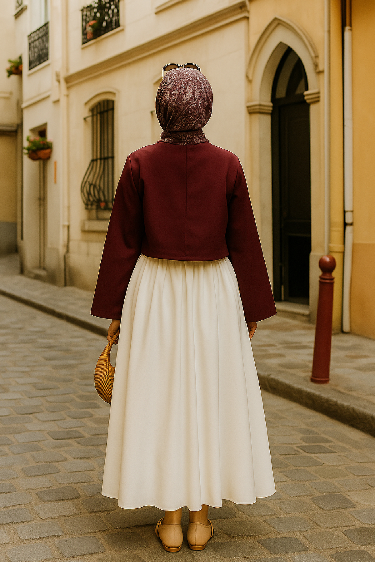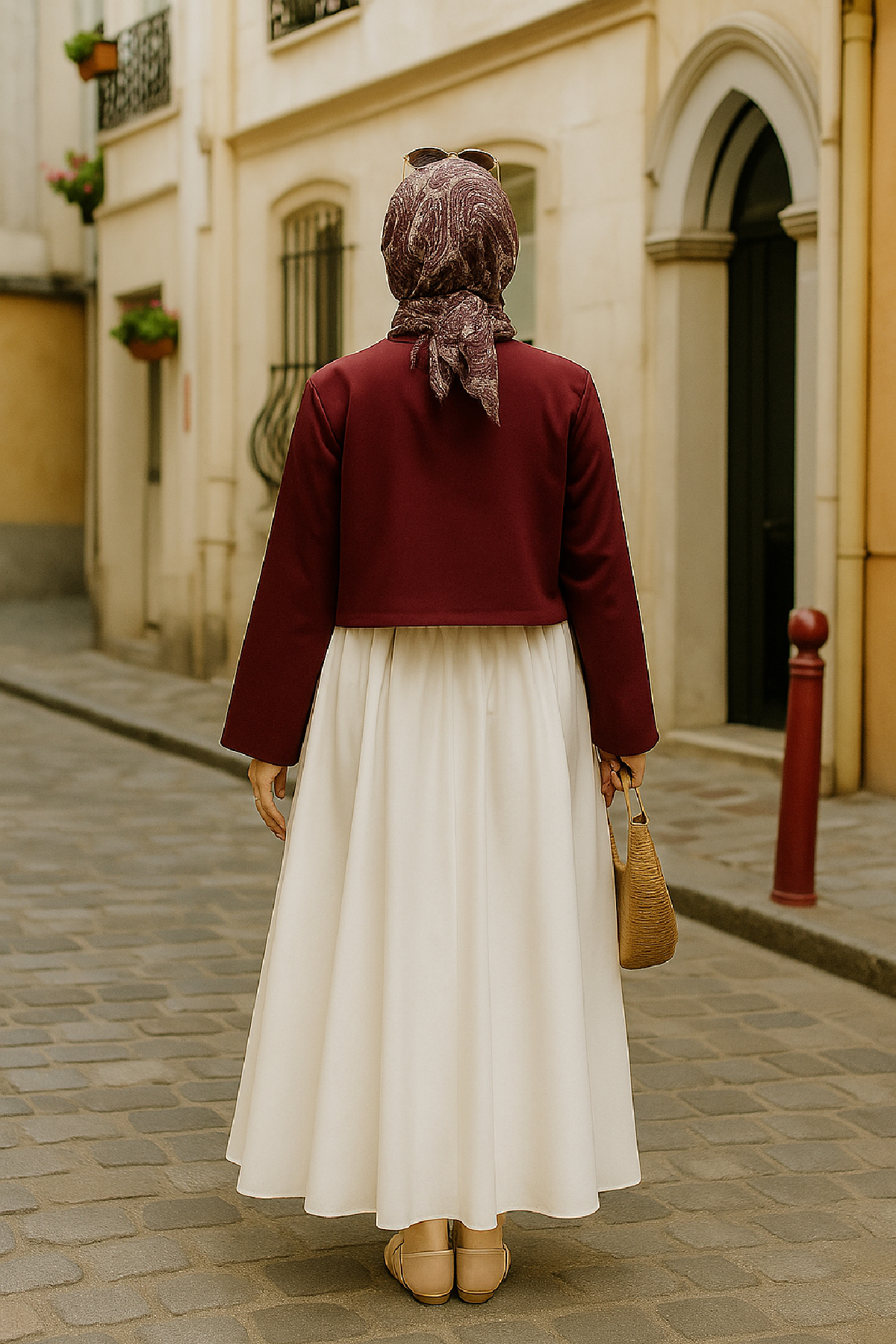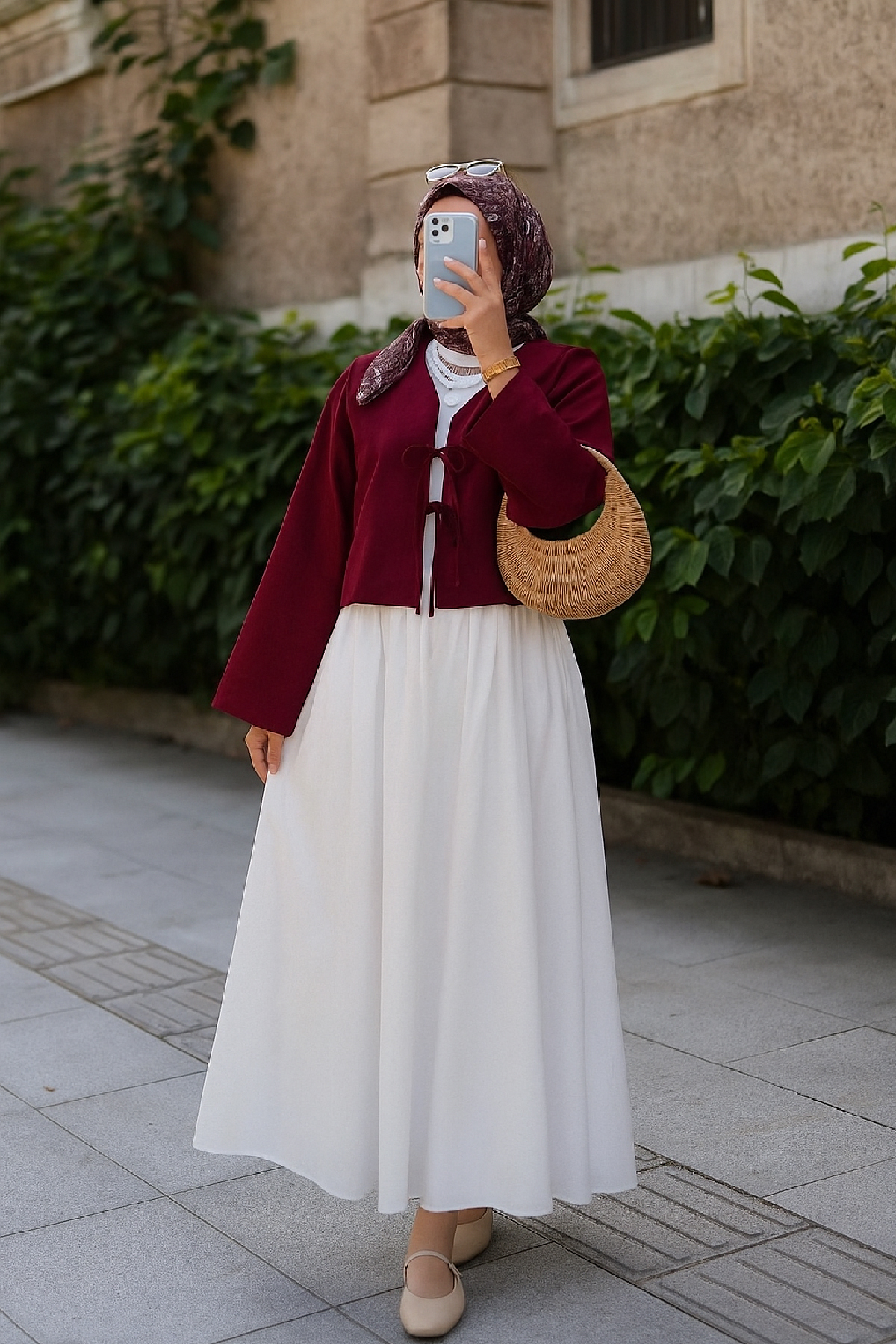 Bu bordo kimono ceket, beyaz veya krem rengi elbiselerle bir araya getirildiğinde ferah ve zarif bir görünüm yaratır. Geniş paça pantolonlar ve topuklu ayakkabılarla tamamlandığında ise sofistike bir şehir stili elde edebilirsiniz. Tesettür giyimde uzun tunik veya elbise üzerine kombinlenerek şık bir alternatif sunar. Şehirde özgün ve dikkat çekici bir tarz yaratmak isteyenler için idealdir.