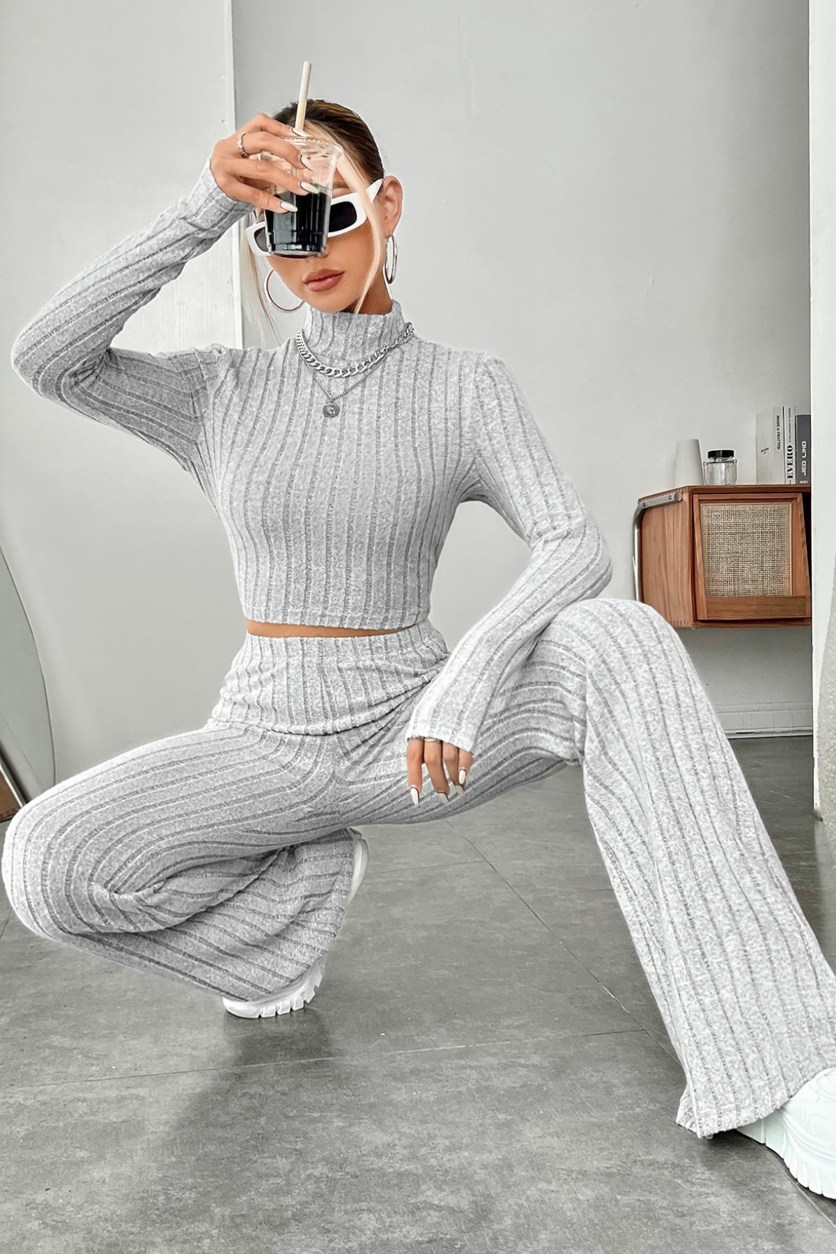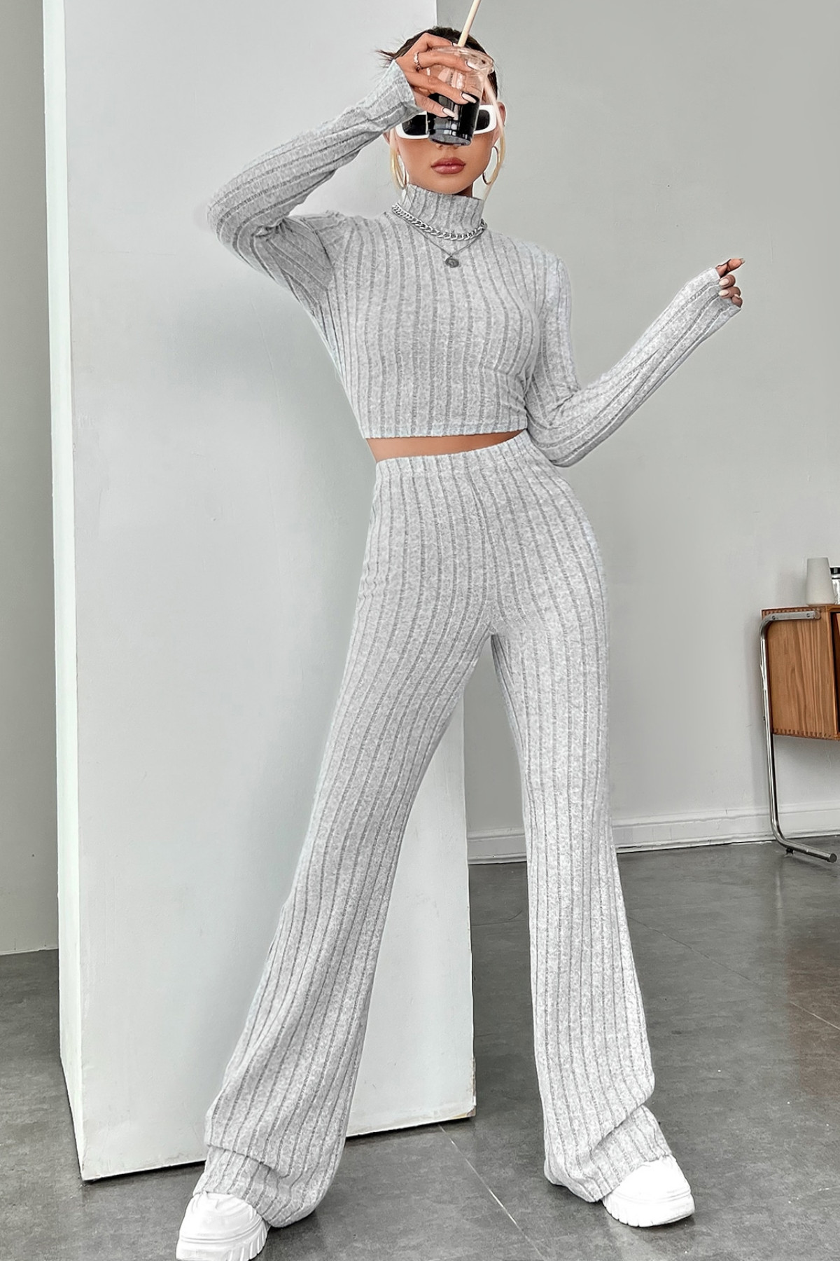 Modern ve Şık: Kadın Gri Çizgili Boğazlı Crop Top & Pantolon Eşofman Takımı