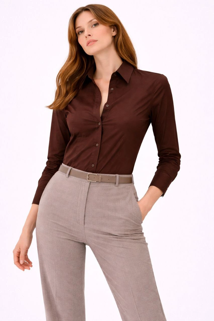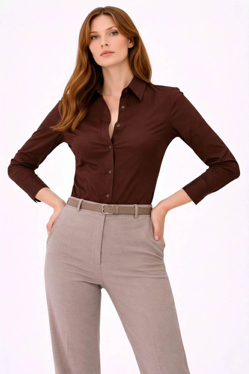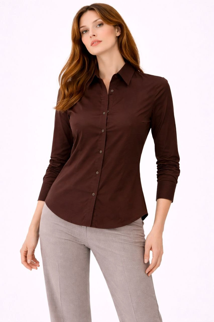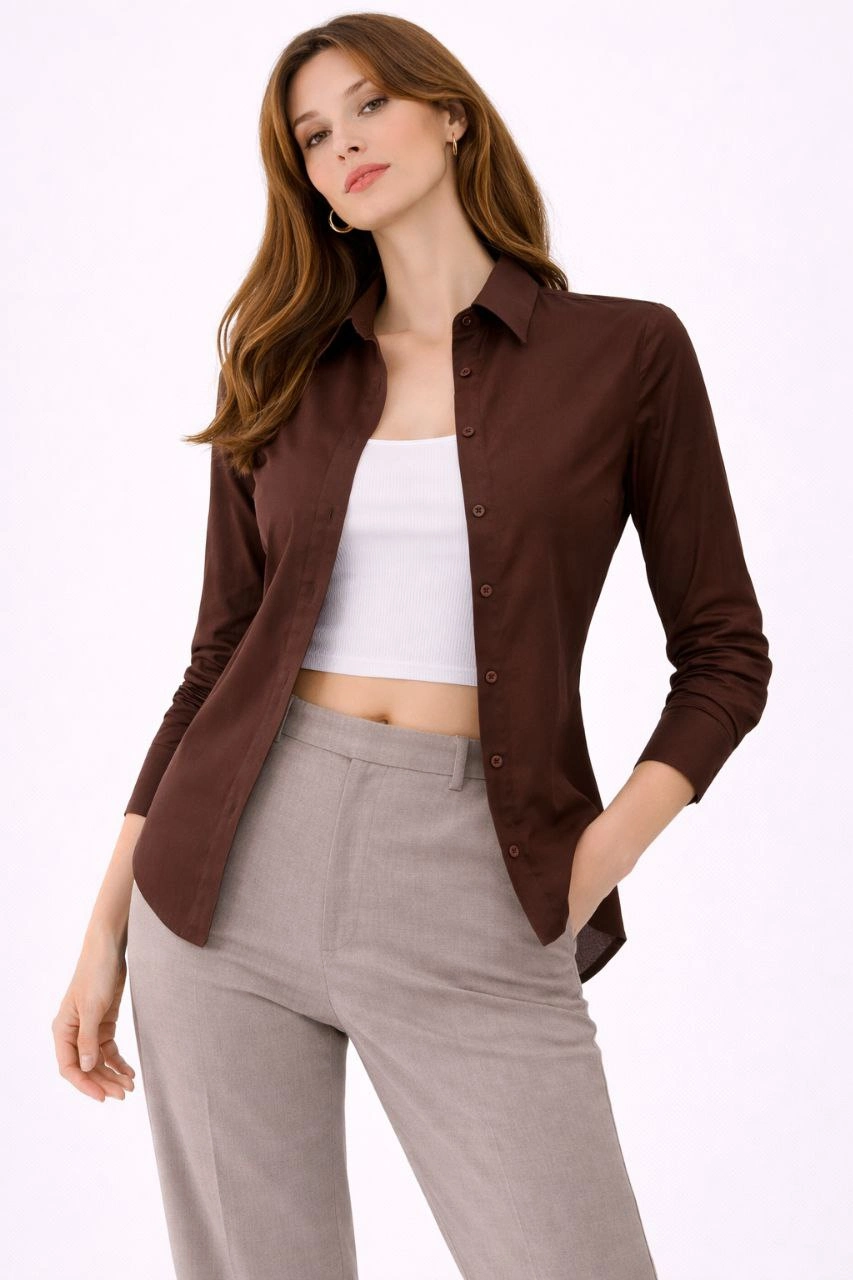 Kadın Uzun Kollu Gömlek Düğmeli Klasik Yaka Günlük ve Ofis Şıklığına uygun - Kahverengi