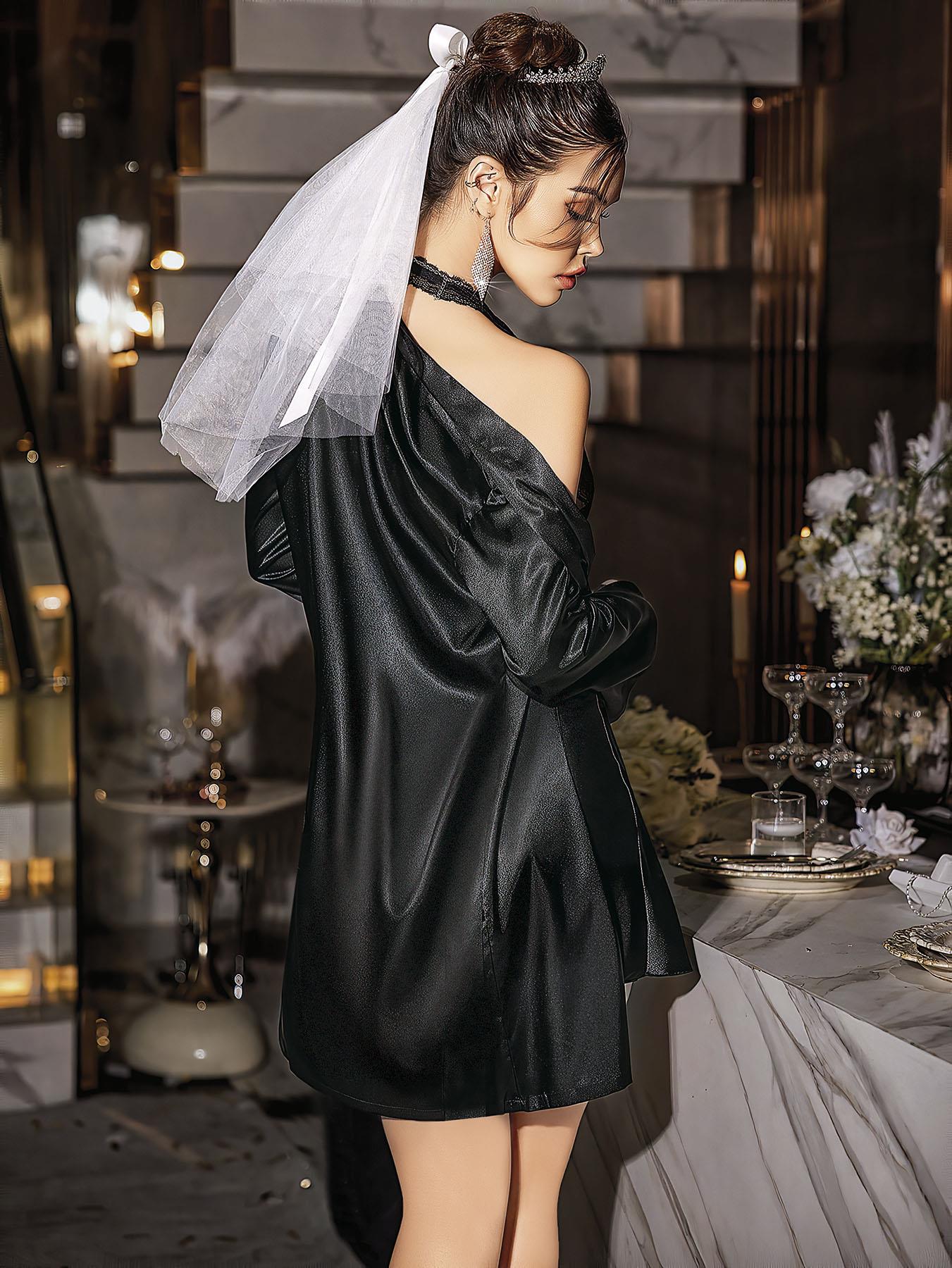 Özel Tasarım Kurdelalı Dantel İşlemeli Şık Göğüs Dekolteli Sabahlıklı 2'li Siyah Saten Gecelik Takımı