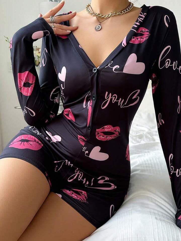 - Pamuklu Kırmızı Kalp Desenli Düğmeli Uzun Kol Tulum Pijama