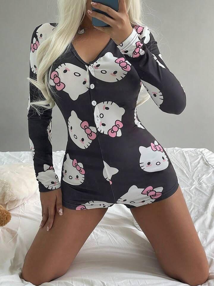- Pamuklu Siyah Hello Kitty Desenli Düğmeli Uzun Kol Tulum Pijama