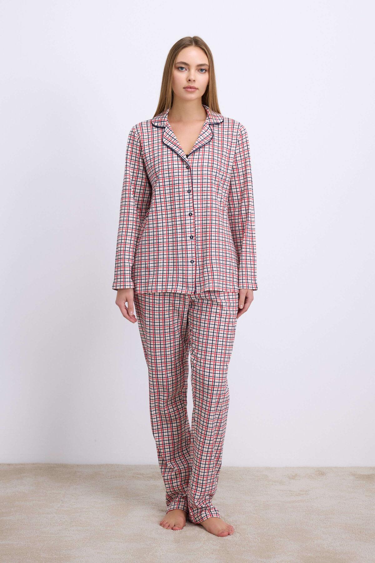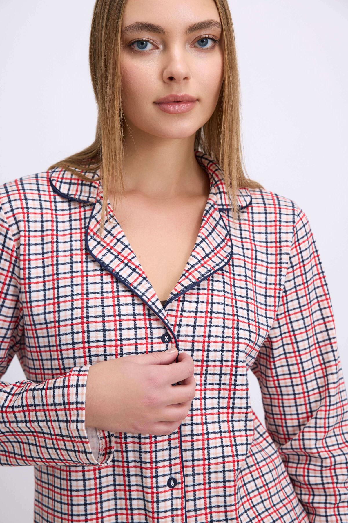 - Pamuklu Uzun Kol Düğmeli Gömlek Ve Ekose Pantolon Pijama Takımı