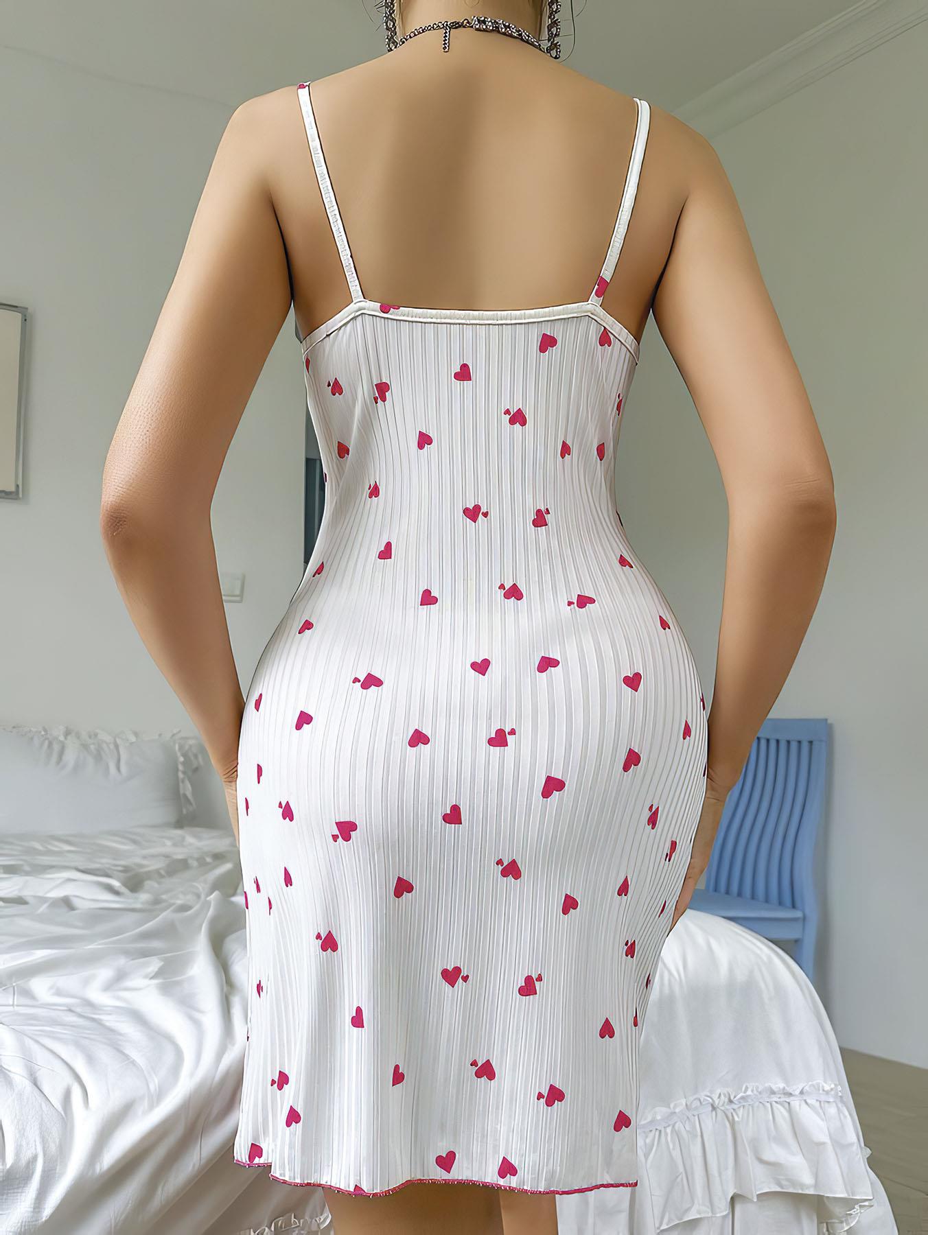 - Şık Tasarım Pamuklu Beyaz Üstüne Kalp Desenli Dantel İşlemeli Gecelik
