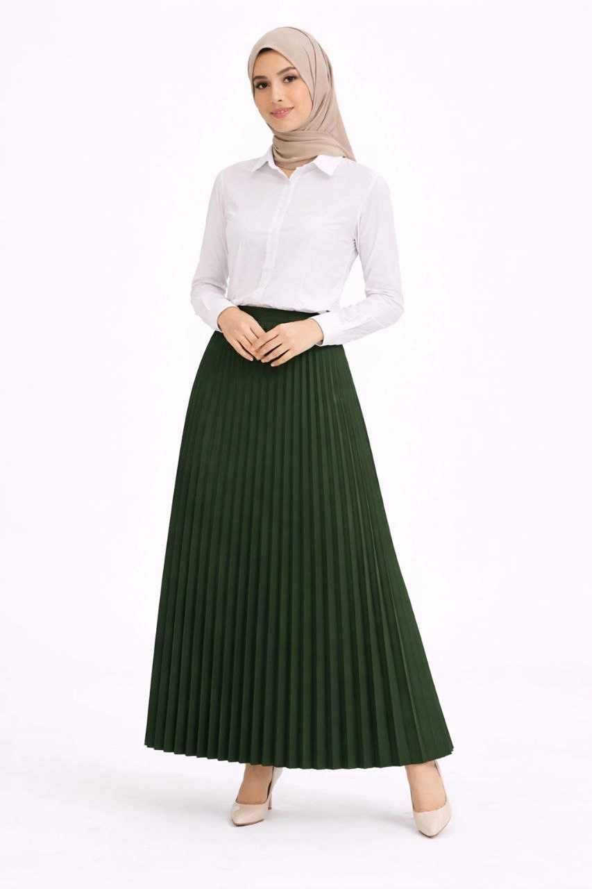 Tesettür Beyaz Gömlekli Pliseli Etek İkili Takım Gündelik ve Ofis Şıklığı - Çağla Yeşili