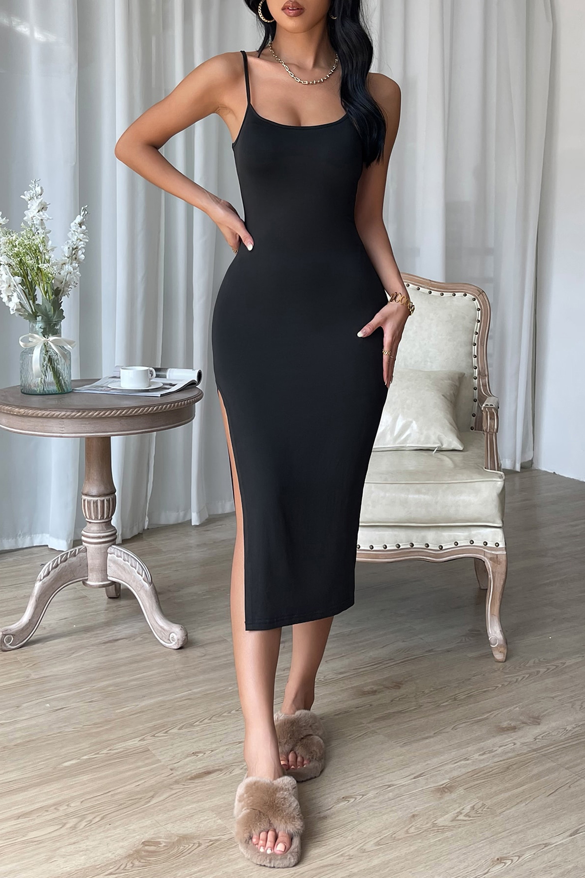 Kent Moda'nın bu çarpıcı siyah geceliği, vücudunuzu saran kesimi ve cesur yırtmaç detayı ile hem şıklığınızı tamamlayacak hem de özgür hareket etmenizi sağlayacaktır. Stüdyo çekimlerinde görünen derin siyah rengi, kaliteli kumaşı ve zarif tasarımıyla bu elbise, ev konforunda bile tarzınızı yansıtmanızı sağlar.